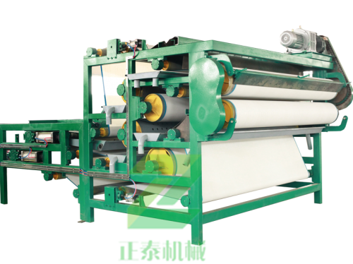 2、工作原理:經過濃縮的汙泥與一定濃度的絮凝劑在靜、動態混合器中充分混合以後,汙泥中的微小固體顆粒聚凝成體積較大的絮狀團塊,同時分離出自由水,絮凝後的汙泥被輸送到濃縮重力脫水的濾帶上,在重力的作用下自由水被分離,形成不流動狀態的汙泥,然後夾持在上下兩條網帶之間,經過楔形預壓區、低壓區和高壓區由小到大的擠壓力、剪切力作用下,逐步擠壓汙泥,以達到程度的泥、水分離,形成濾餅排出。